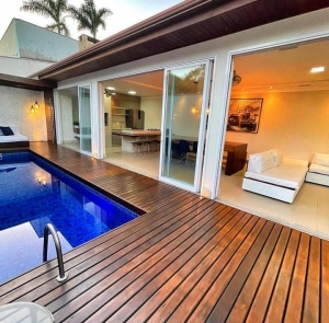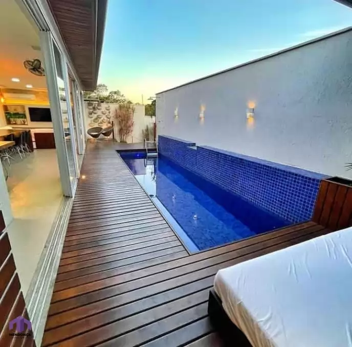 Casa com 3 quartos sendo 2 suítes, 2 salas amplas, banheiro social, cozinha, área de serviço, área gourmet com churrasqueira, armários, piso em porcelanato e granito, piscina, terraço.